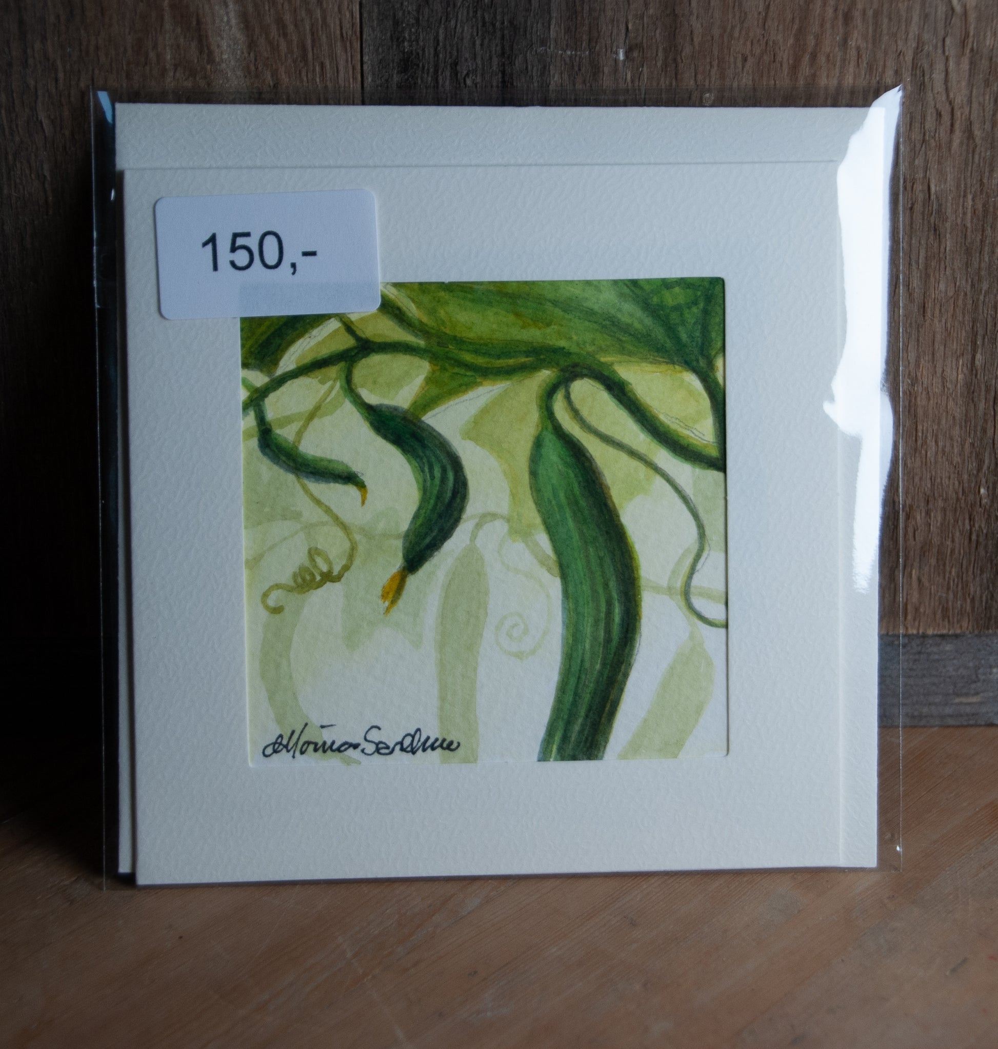 Dette håndmalte akvarellkortet fanger den friske og grønne stemningen fra sommerdrivhuset. Et unikt kunstverkseksemplar som feirer hagegleder. Montert i passepartoutkort.