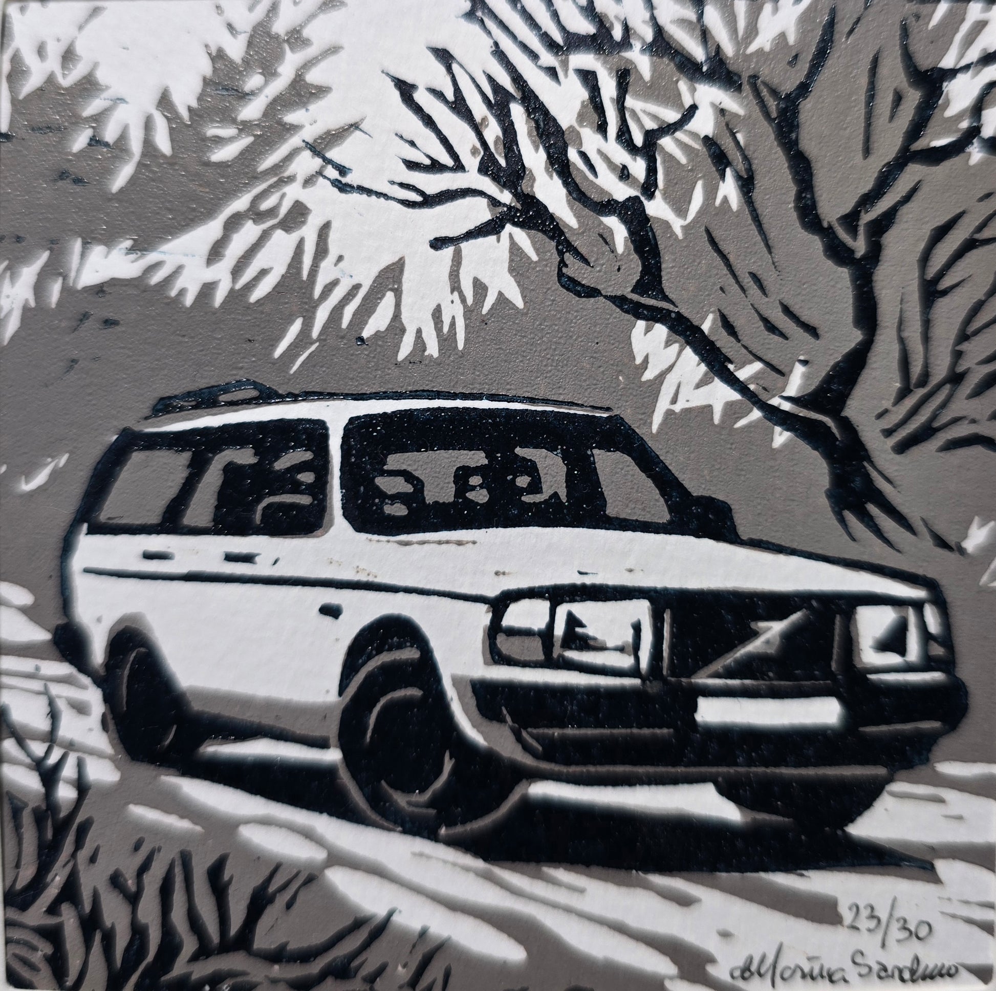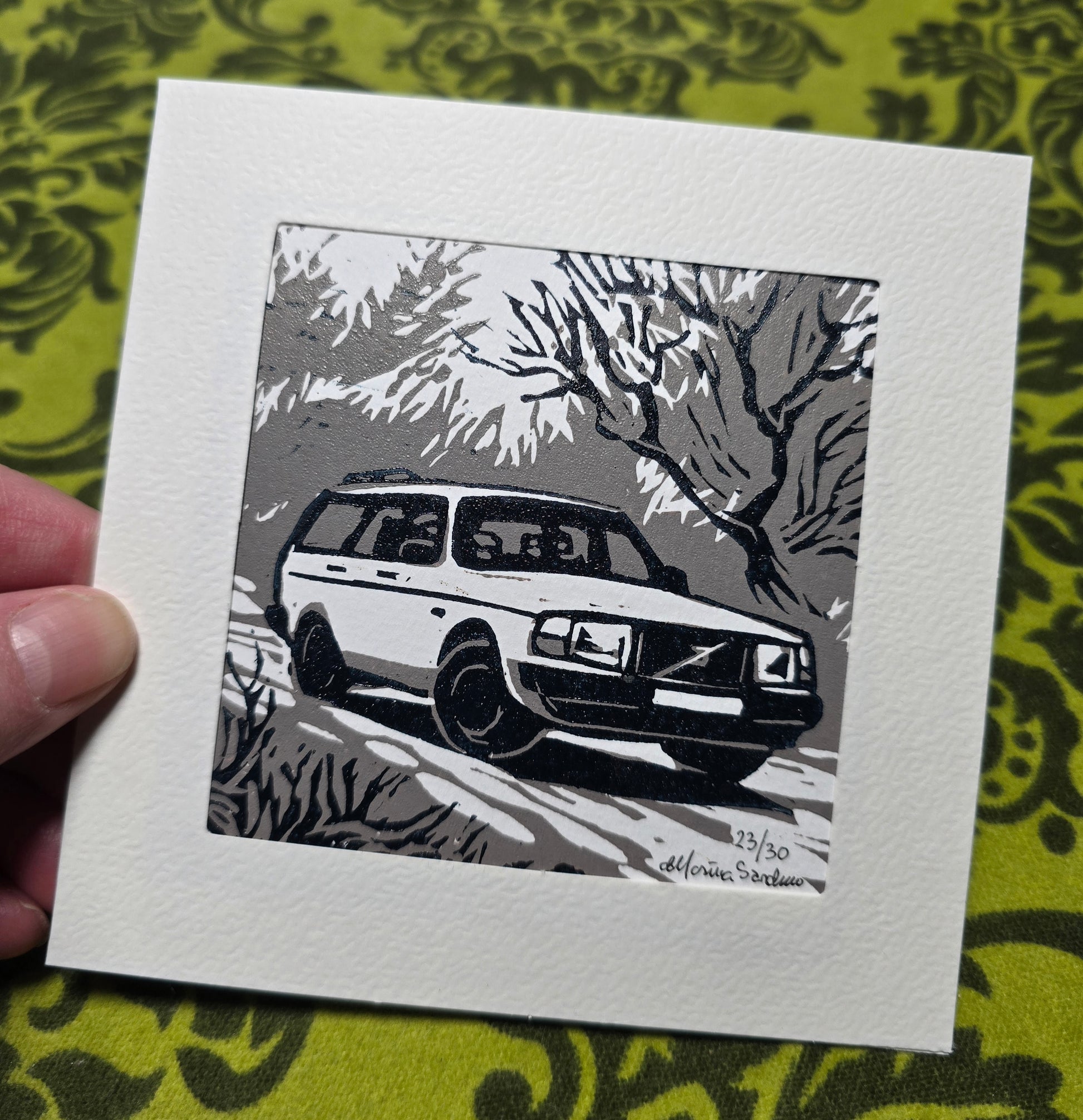 Linosnitt / trykk. Trykket med to plater. Motiv: Volvo 240 stasjonsvogn sett forfra. Motivet måler 8,5cm x8,5cm. Kortet måler 12,5 x 12,5 cm. Unikt trykk, opplag 30 stk.