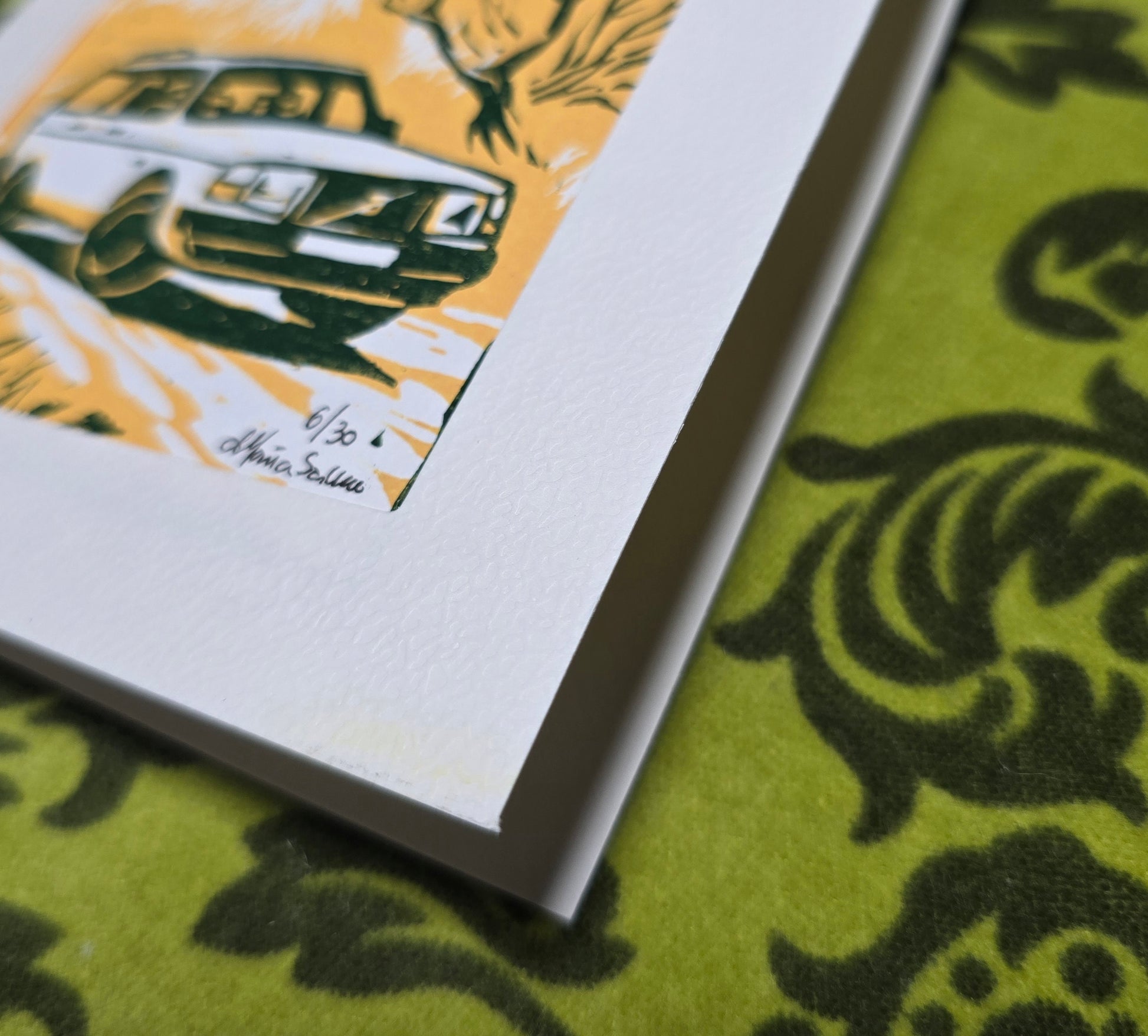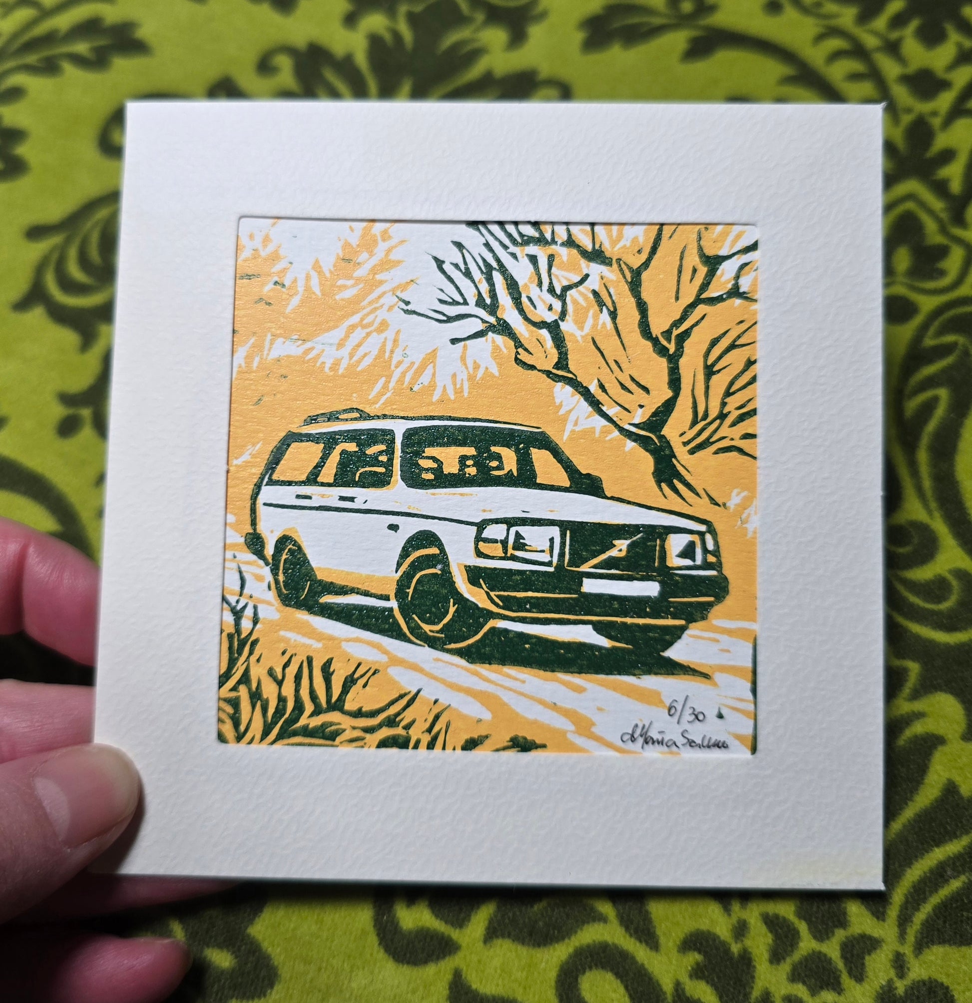 Linosnitt / trykk. Trykket med to plater. Motiv: Volvo 240 stasjonsvogn sett forfra. Motivet måler 8,5cm x8,5cm. Kortet måler 12,5 x 12,5 cm. Unikt trykk, opplag 30 stk.