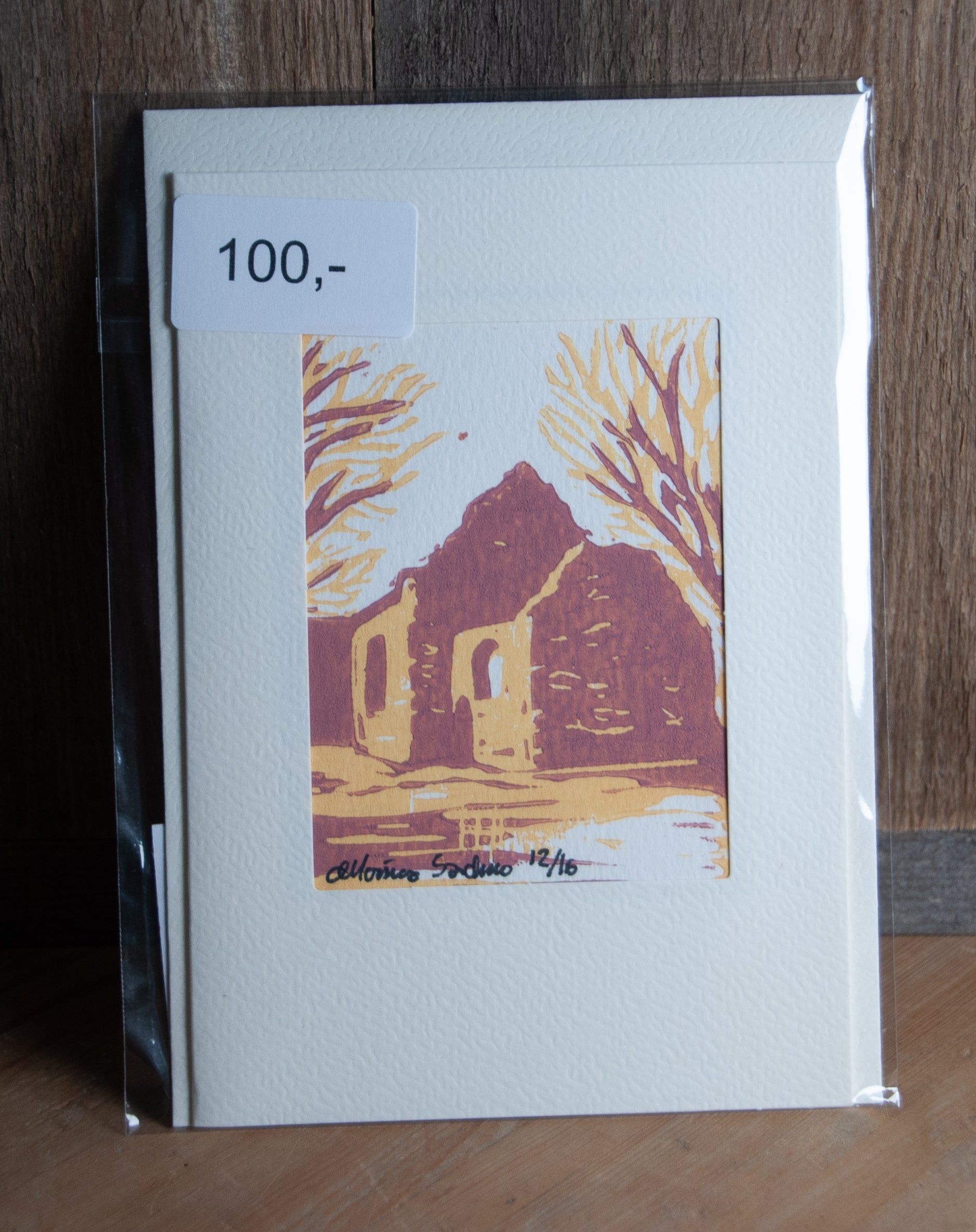 Dette motivet fra Nes kirkeruiner er trykt i 16 unike varianter, hver med sin egen karakter og fargevalg. Perfekt kort til historieinteresserte eller som en unik hilsen fra Akershus.