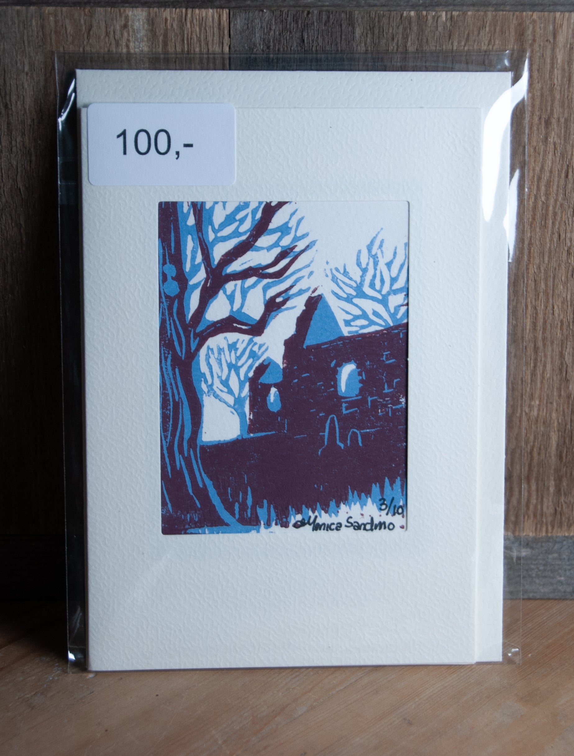 Dette kortet er håndlaget linosnitt/trykk. Hvert kort er unikt trykt for hånd, noe som gjør at dette er et helt unikt eksemplar. Du får et ekte håndlaget kunstverk som det kun finnes ett av.