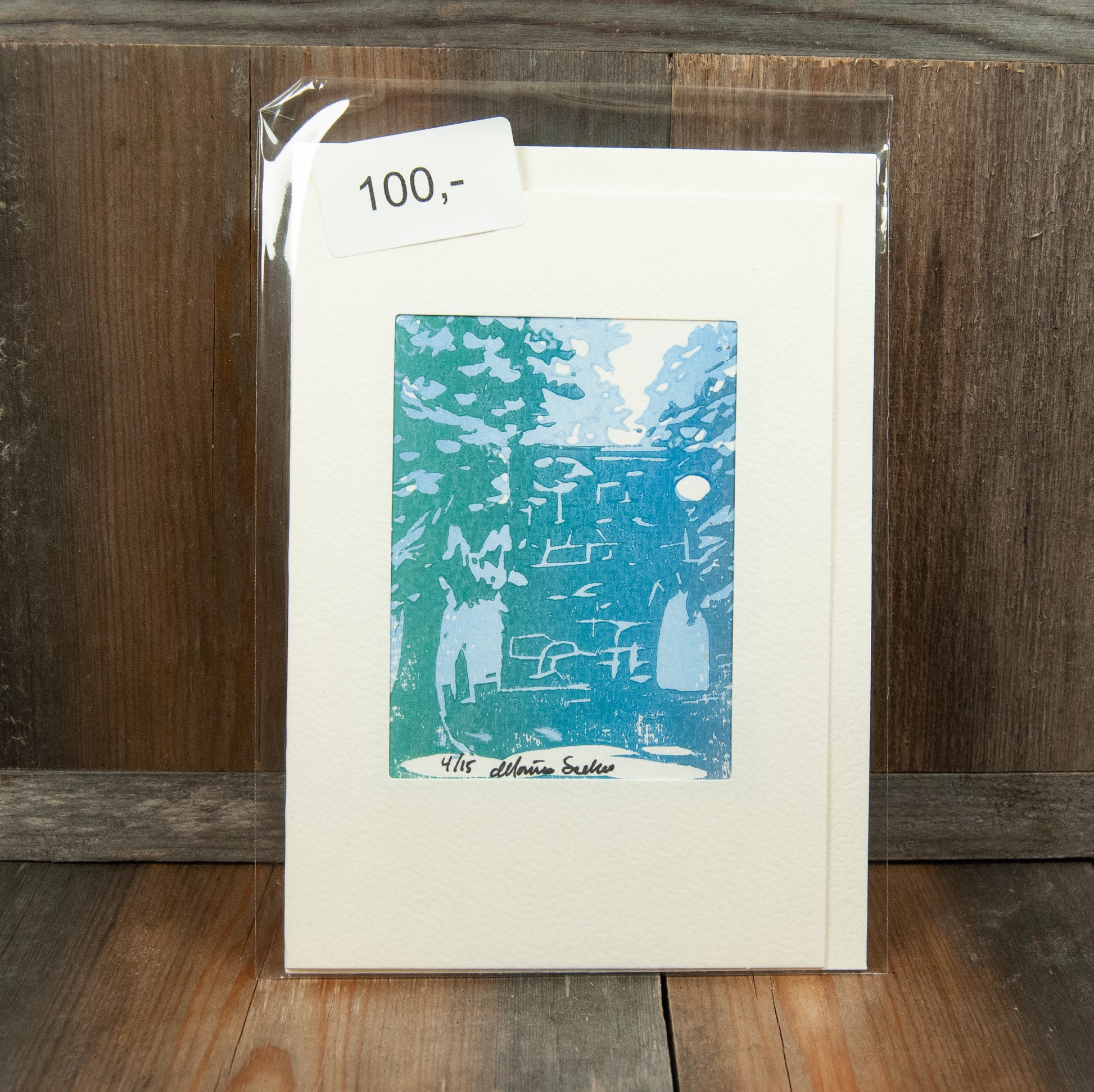 Dette kortet er håndlaget linosnitt/trykk. Hvert kort er unikt trykt for hånd, noe som gjør at dette er et helt unikt eksemplar. Du får et ekte håndlaget kunstverk som det kun finnes ett av.
