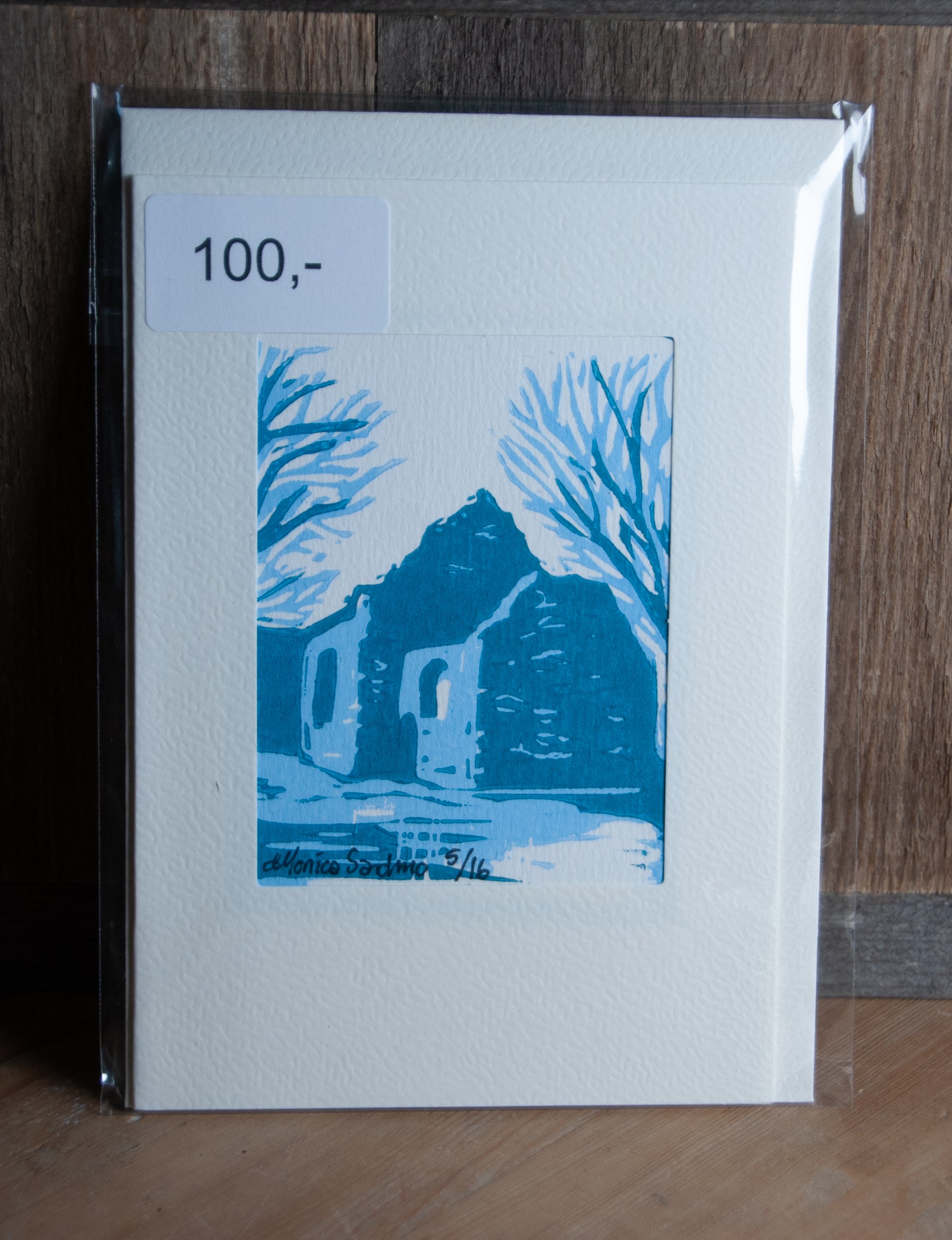 Dette motivet fra Nes kirkeruiner er trykt i 16 unike varianter, hver med sin egen karakter og fargevalg. Perfekt kort til historieinteresserte eller som en unik hilsen fra Akershus.