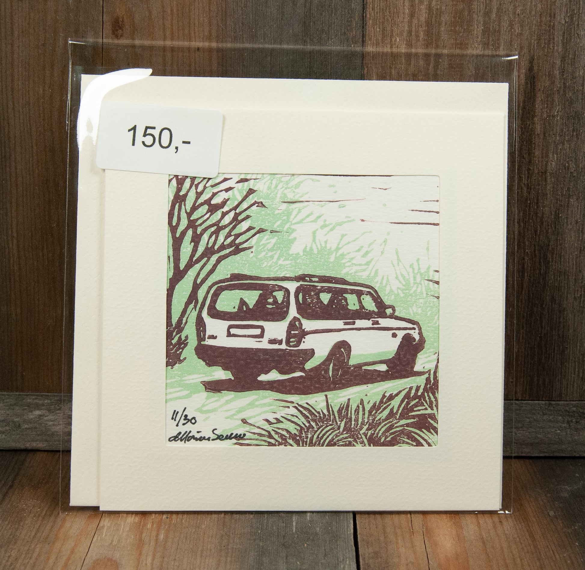Håndlaget linosnitt/trykk, trykt med to plater for ekstra dybde og detaljer. Hvert kort er unikt trykt for hånd, noe som gjør at ingen to kort er helt like.
