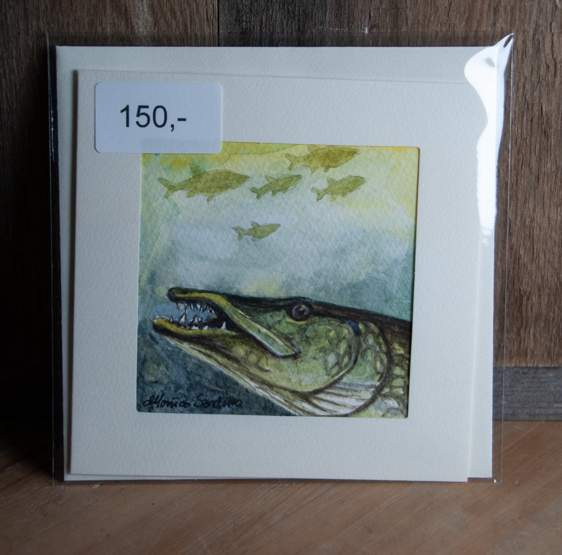 Dette fascinerende akvarellkortet viser en gjedde som lurer i vannet. Håndmalt med omhu og kunstnerisk presisjon, fanger dette kortet rovfiskens mystikk og kraft.
