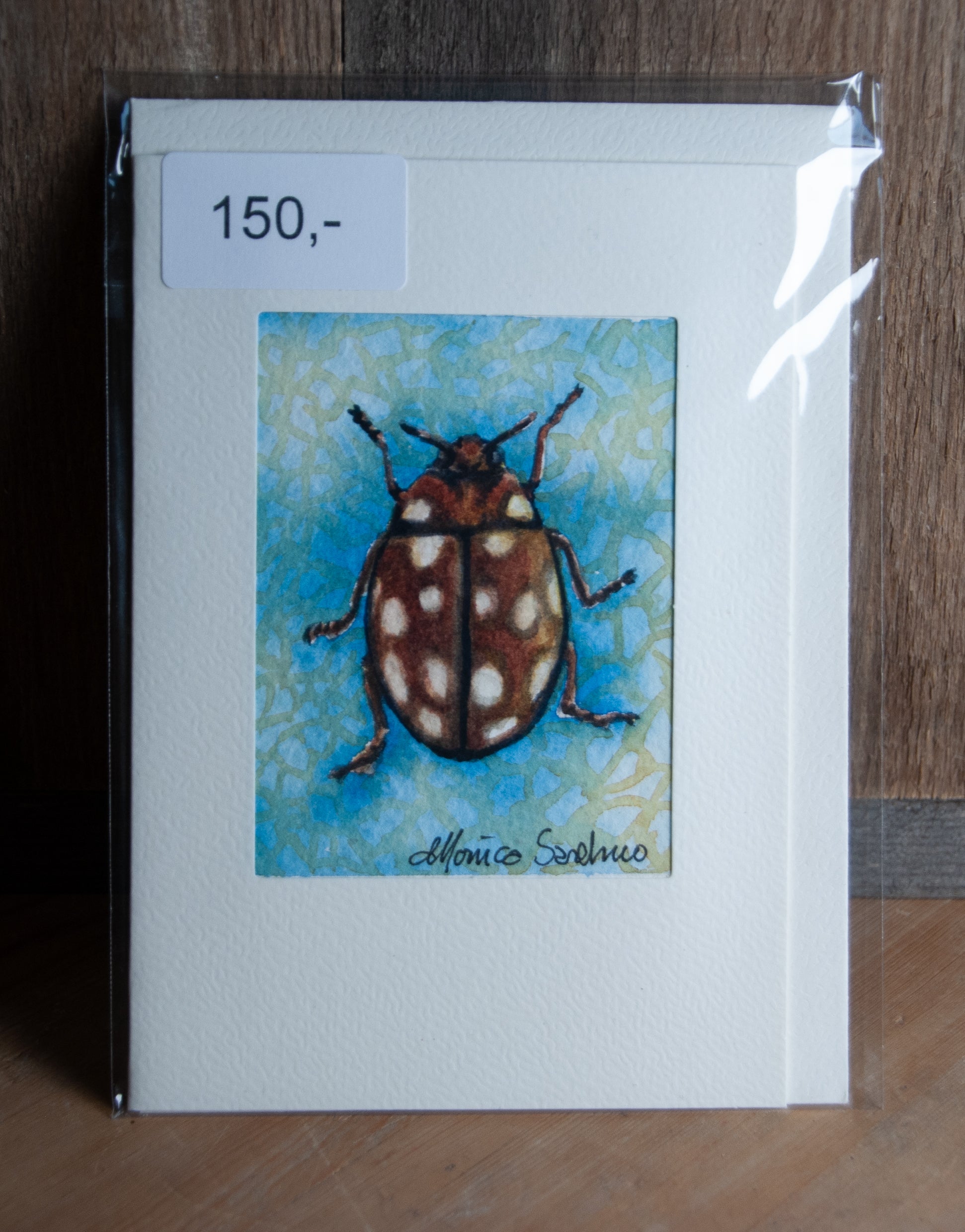 Dette er et helt unikt akvarellkort, malt for hånd med omhu og detaljer. Perfekt til den som setter pris på insekter, naturmotiver, håndverk og originalitet.