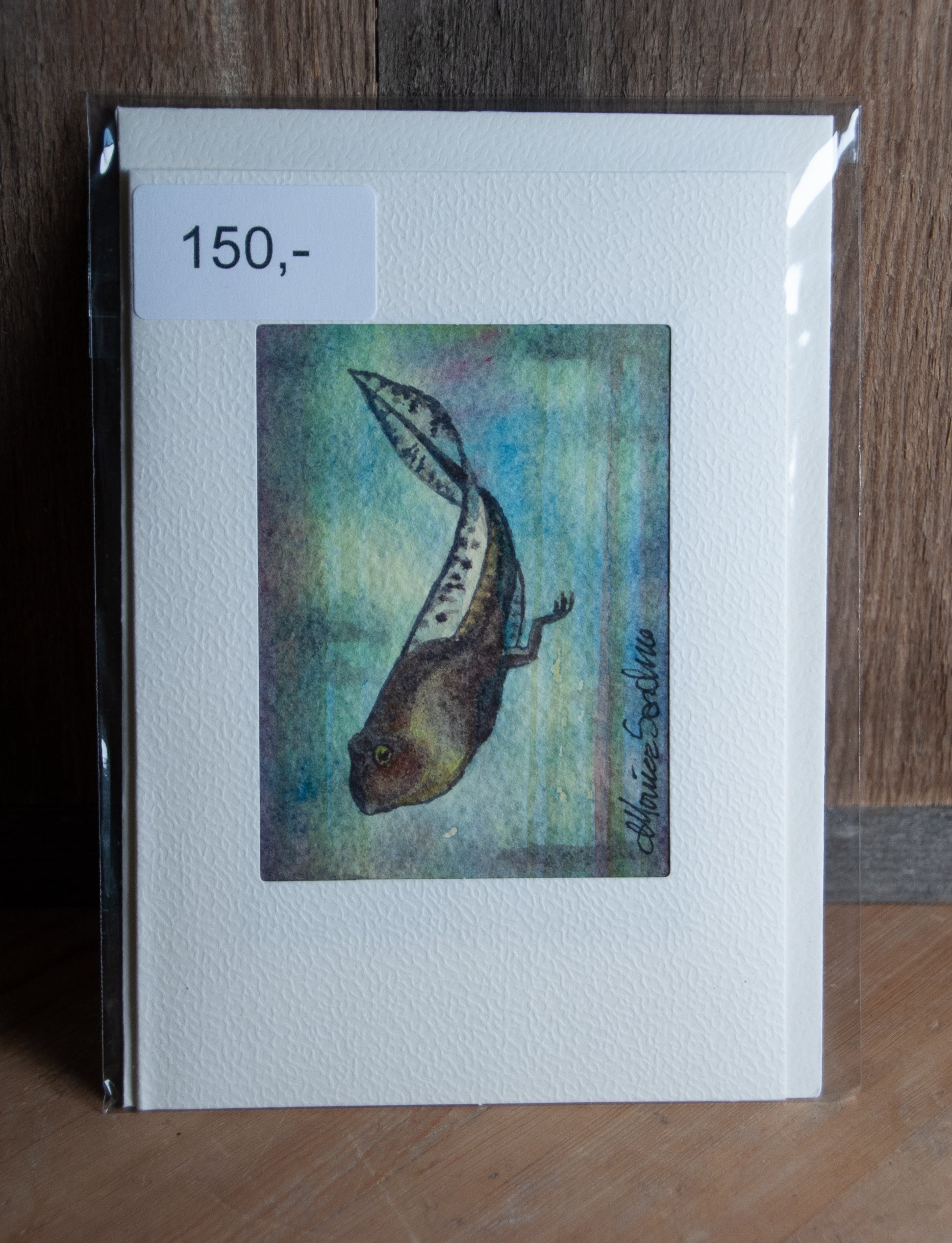 Dette er et helt unikt akvarellkort, malt for hånd med omhu og detaljer. Perfekt til den som setter pris på amfibier, naturmotiver, håndverk og originalitet.
