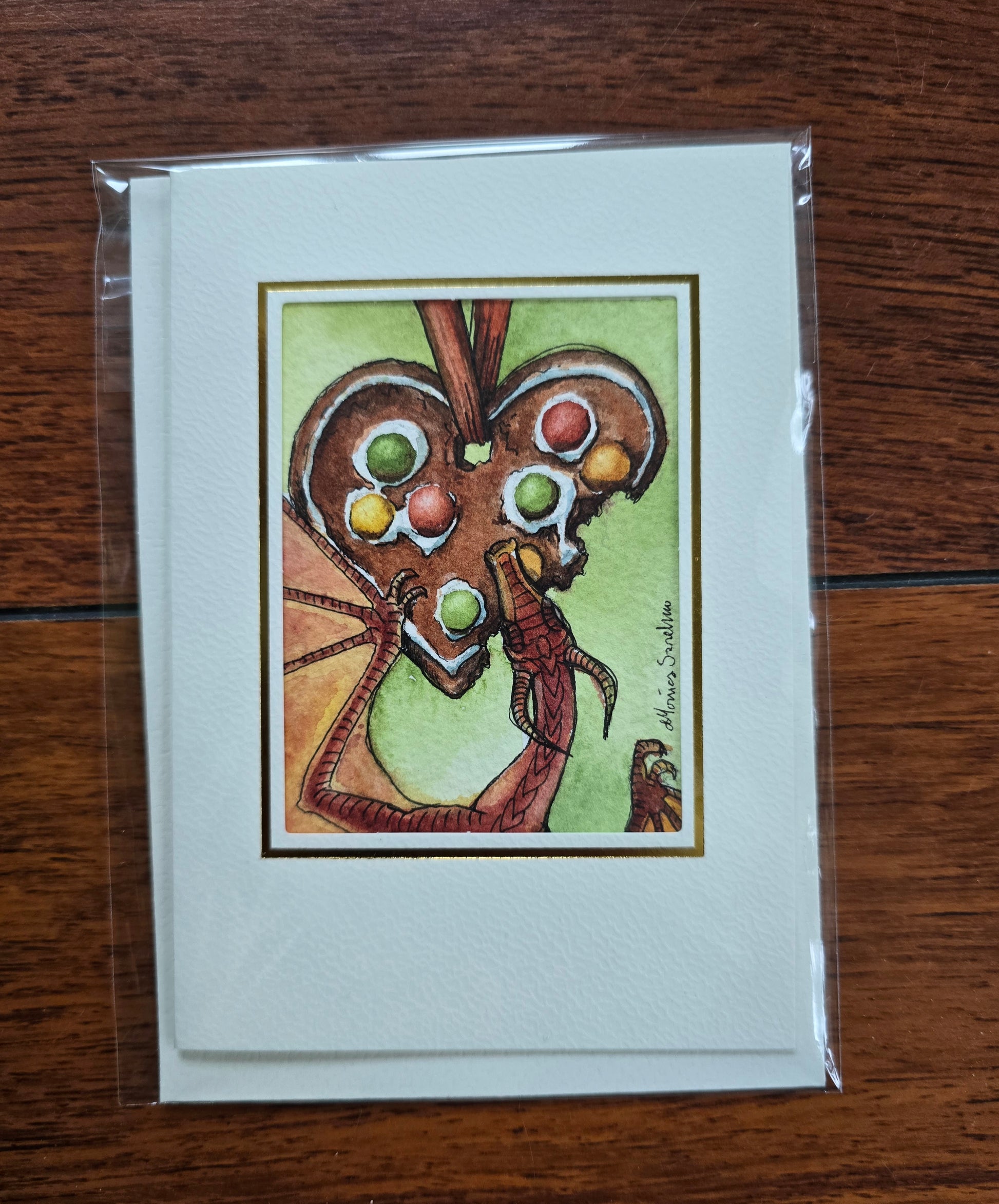 Dette sjarmerende akvarellkortet viser en liten drage som gnafser i vei på et pepperkakehjertet! Håndmalt med omhu og montert i passepartoutkort med gullkant rundt motivet.