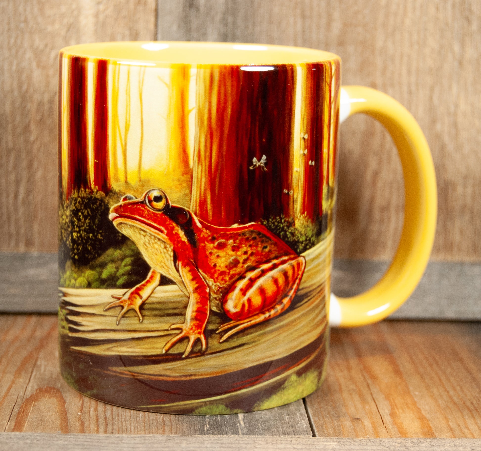 Maleriet på ene siden og et utsnitt av frosken og tekst på andre siden. Med dette fargerike kruset kan du kose deg med varm eller kald drikke. Passer godt for naturelskeren og den som er ekstra glad i amfibier! En koselig kopp med frosk i varme farger.