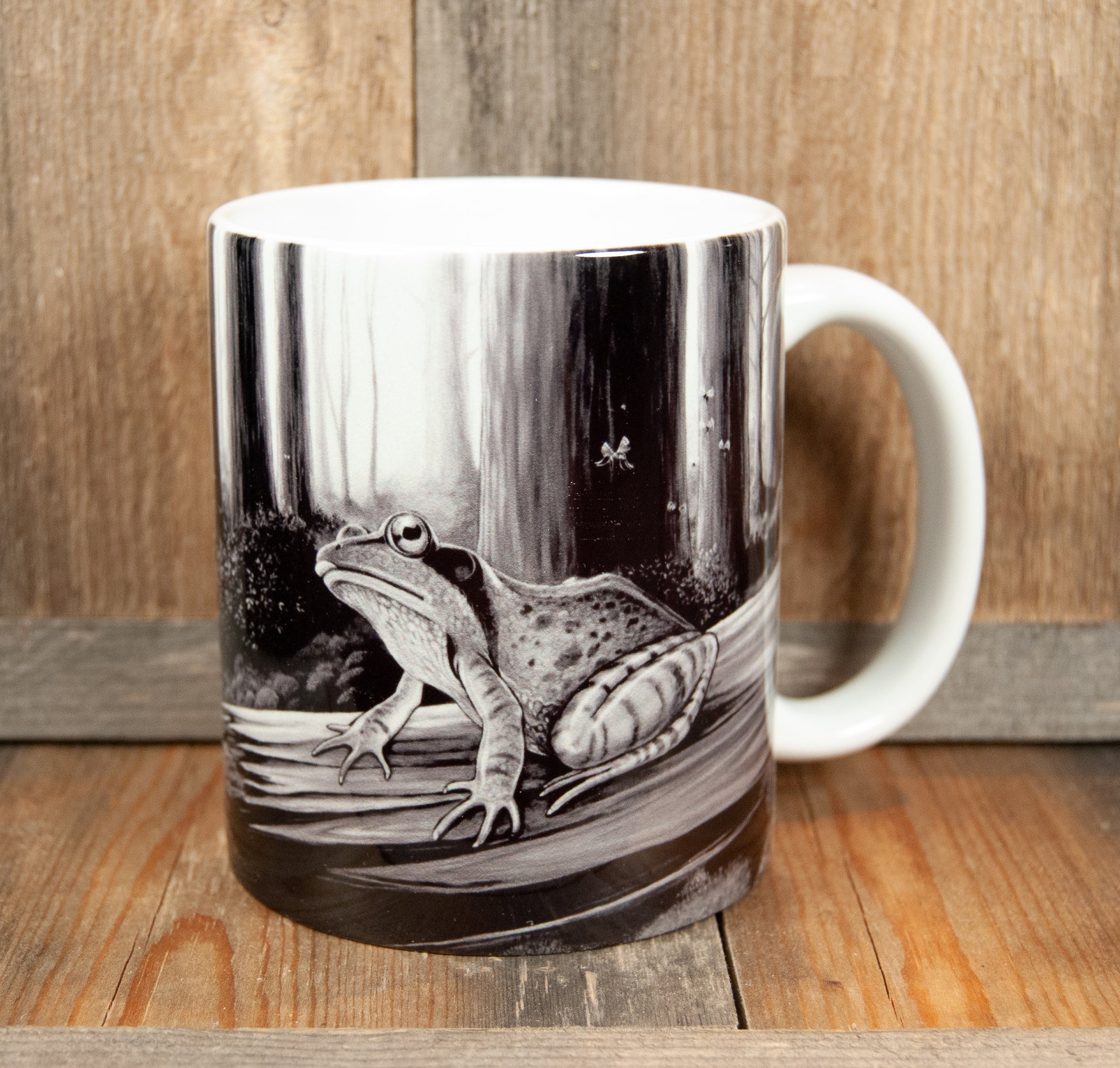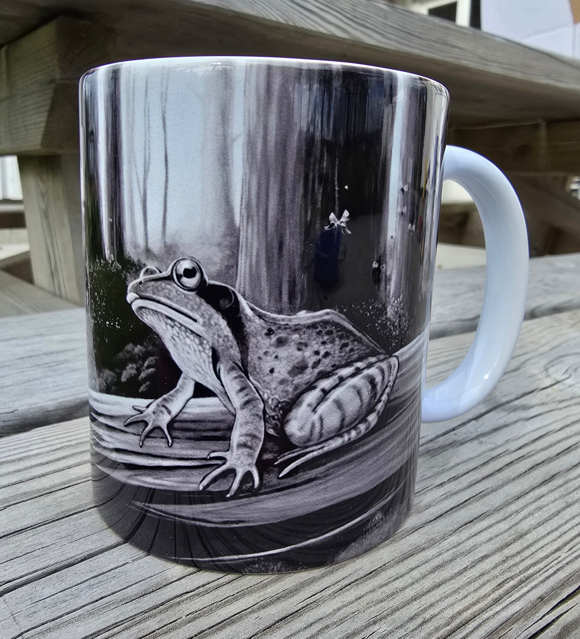 Maleriet på ene siden og et utsnitt av frosken og tekst på andre siden. Med dette tøffe kruset kan du kose deg med varm eller kald drikke. Passer godt for naturelskeren og den som er ekstra glad i amfibier! En koselig kopp med frosk i svart og hvitt.