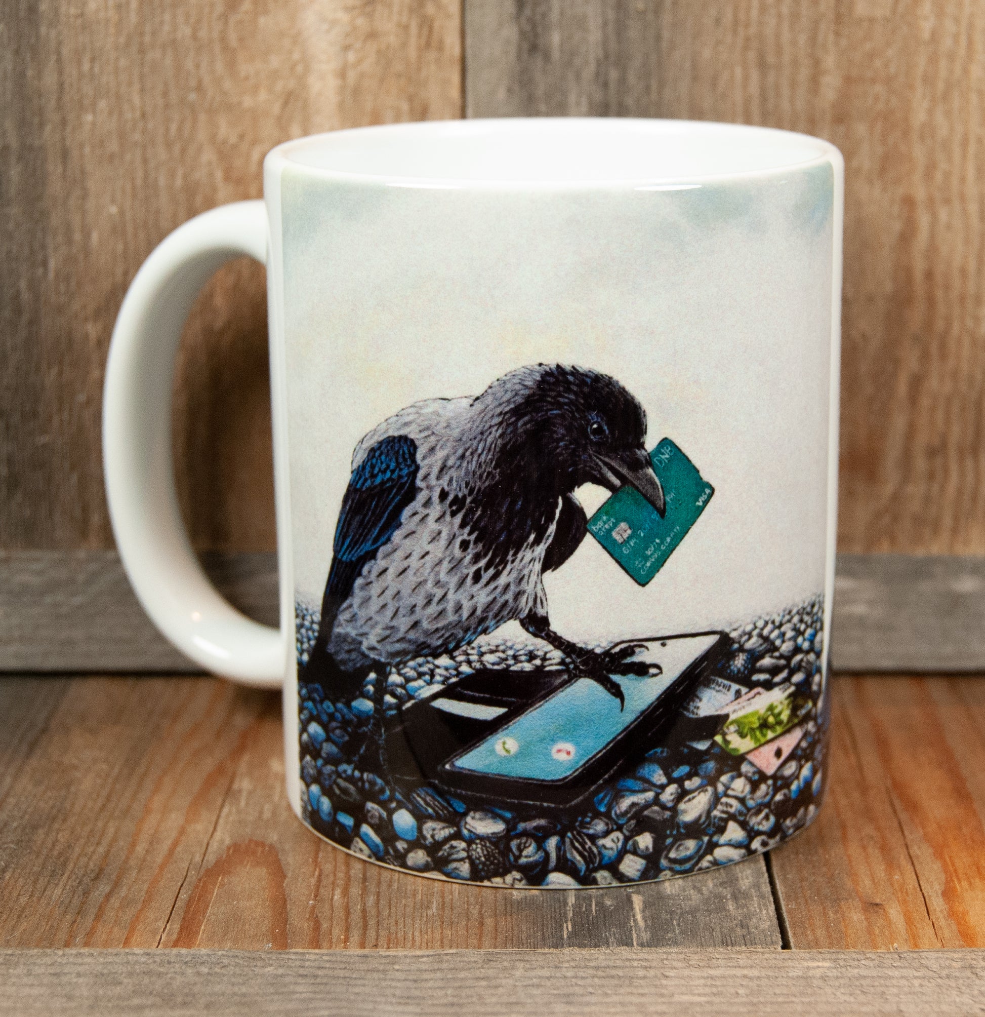 En humoristisk keramikkkopp med motiv fra originalmaleriet "Ugagnskråka" – perfekt for deg som kjenner en ugagnskråke eller to!