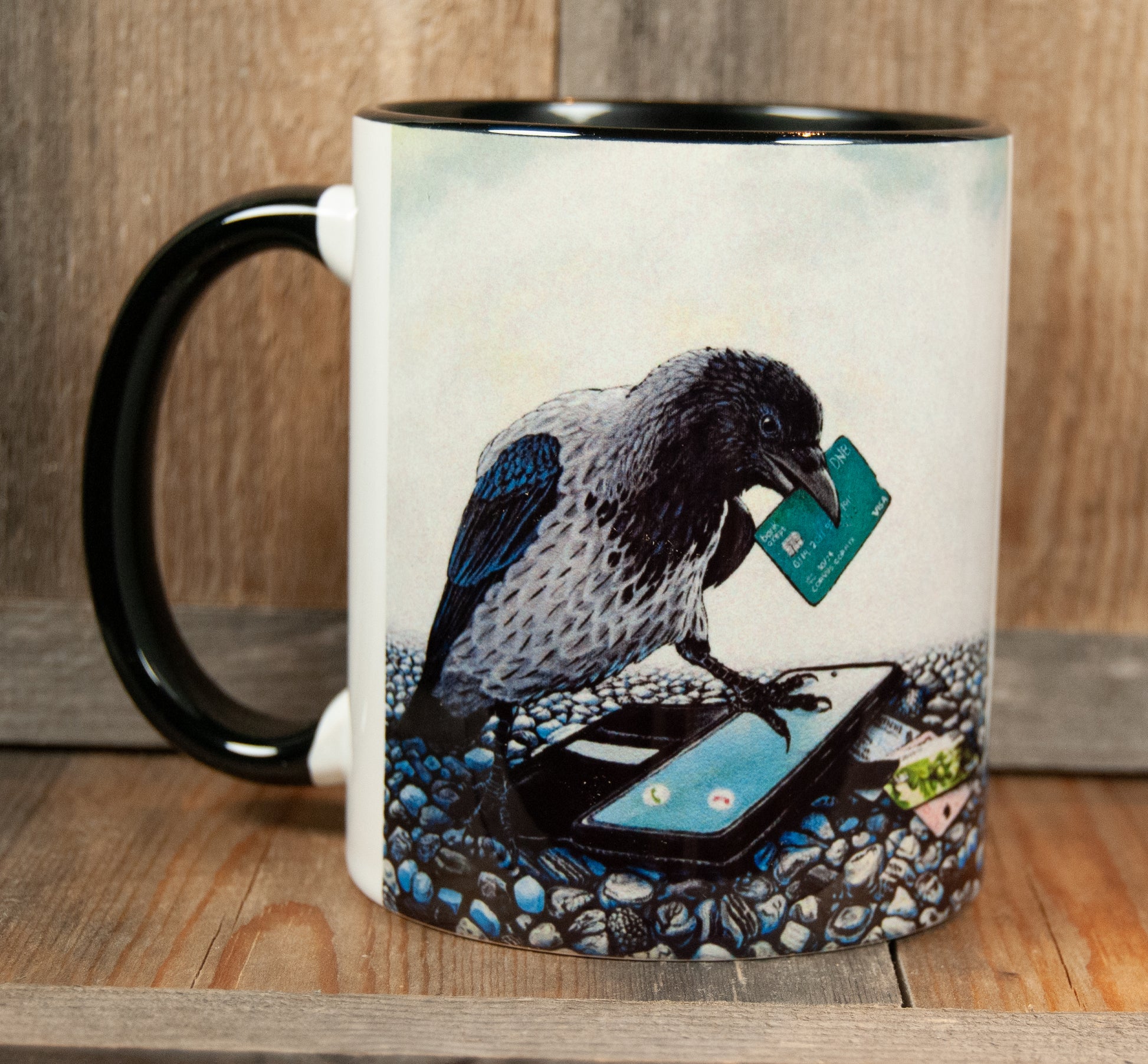 En humoristisk keramikkkopp med motiv fra originalmaleriet "Ugagnskråka" – perfekt for deg som kjenner en ugagnskråke eller to!