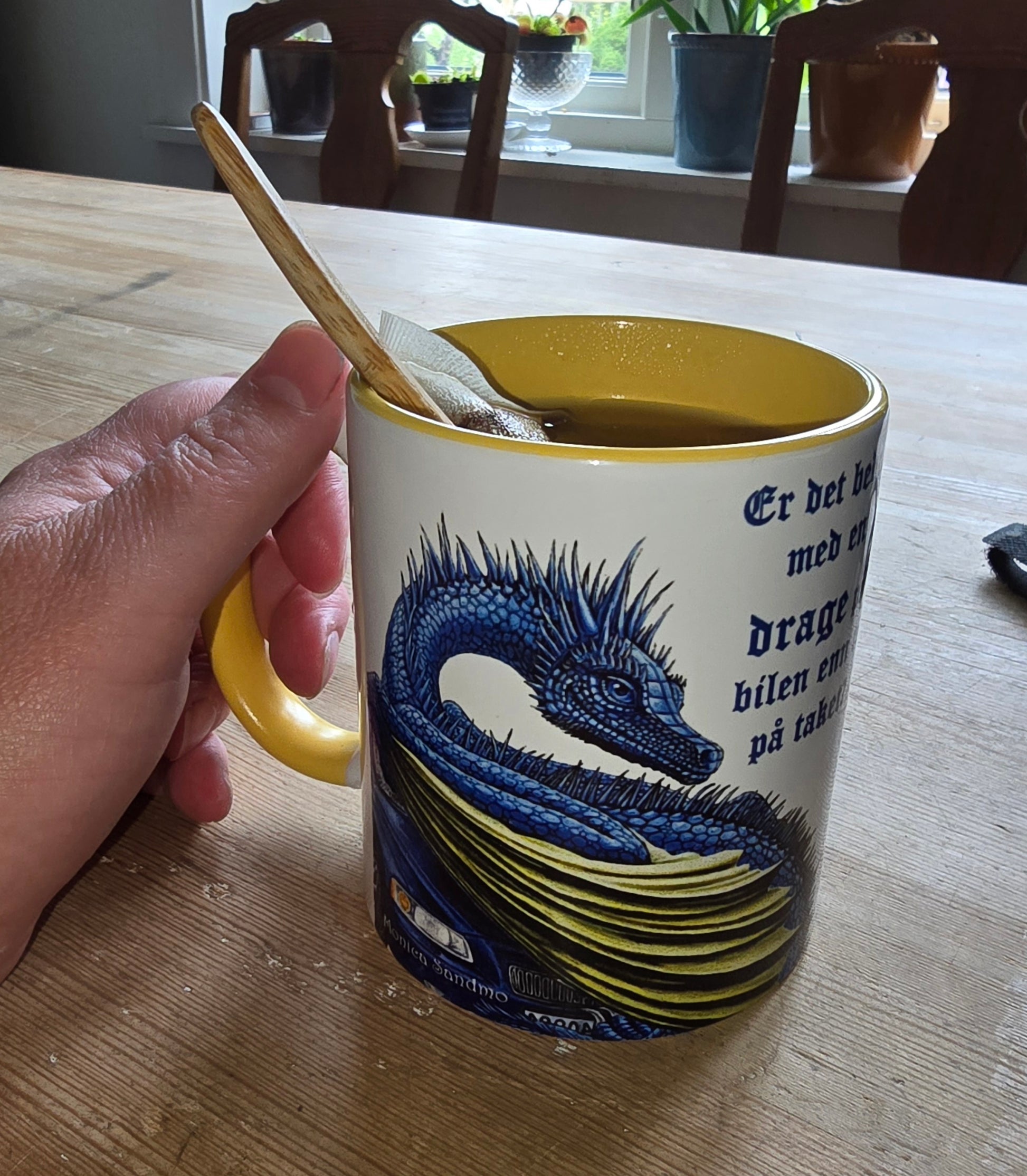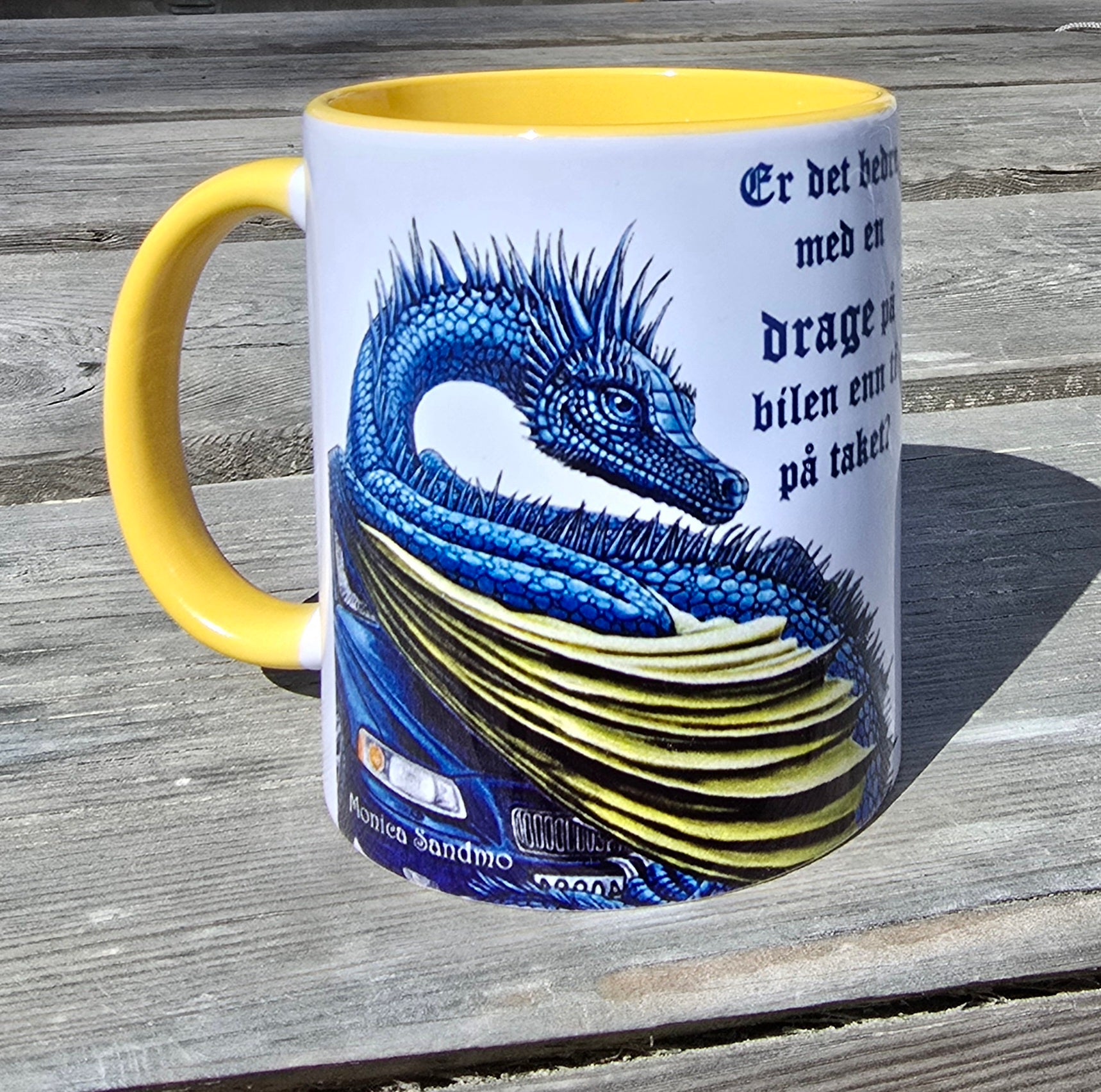 Kopp med motiv fra orginalmaleriet med tittel "Flat Volvo." En humoristisk leken dragekopp. Maleriet ble til av masse frustrasjon over en Volvo som stadig havarerte og krevde masse nye deler. Blå Drage, blå Volvo og gult krus. Selv om frustrasjonen skapte den så er det en godlynt drage og en god bil, som fikk nye deler og går fremdeles.