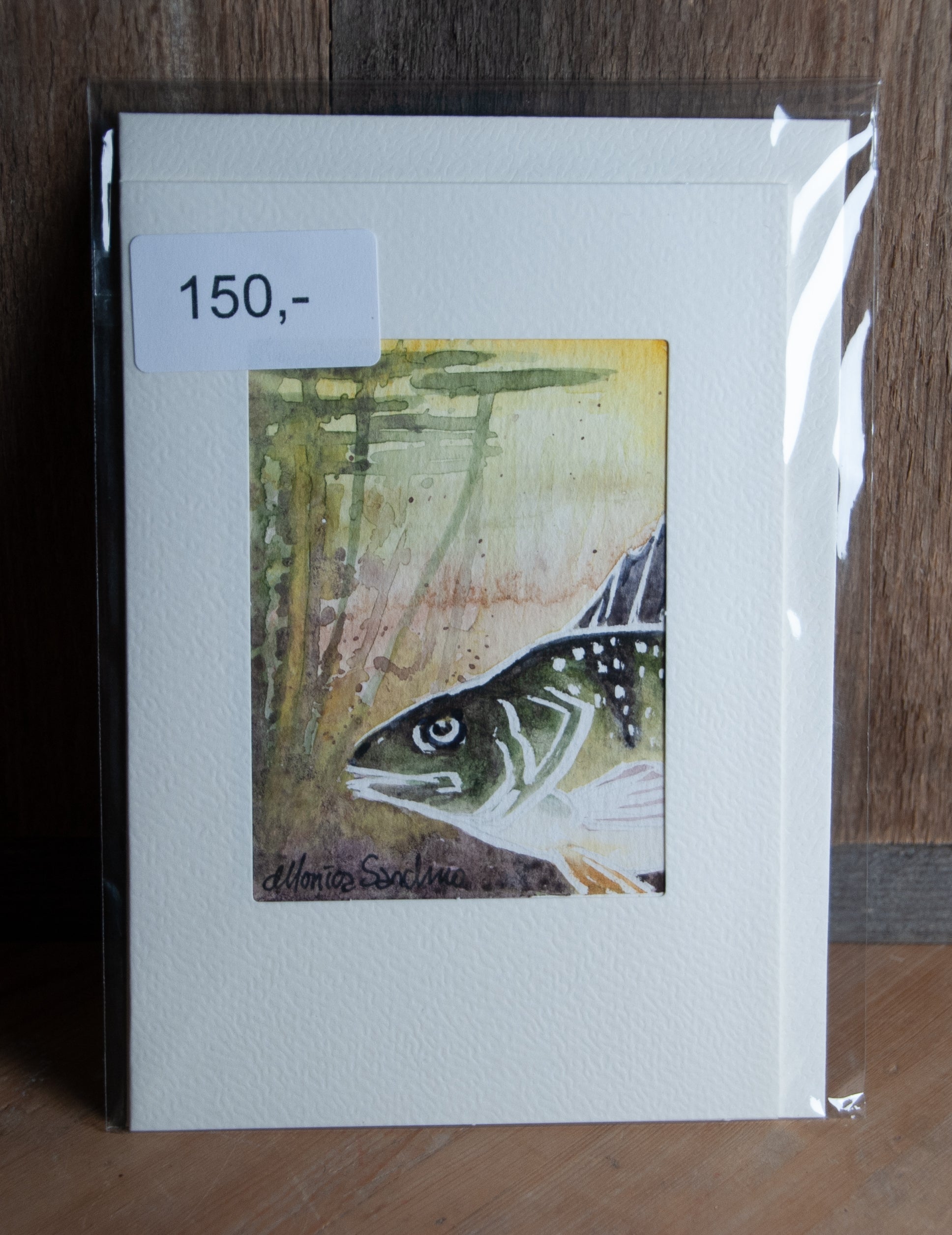 Dette håndmalte akvarellkortet er skapt med maskeringsteknikk, som gir abboren en særegen karakter. Et unikt eksemplar perfekt for fiskeentusiaster og kunstelskere.
