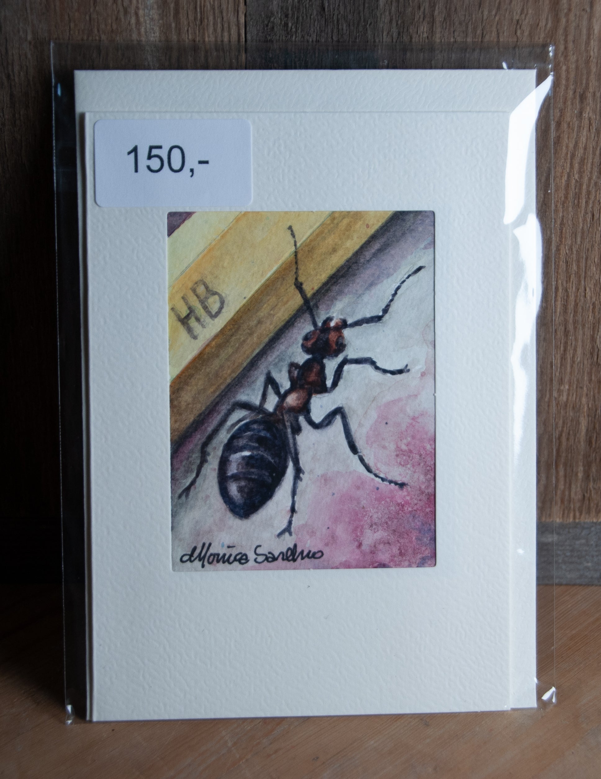 Dette håndmalte akvarellkortet fanger et sjarmerende og humoristisk møte mellom en maur og en blyant. Et unikt kunstverkseksemplar perfekt for å spre glede.