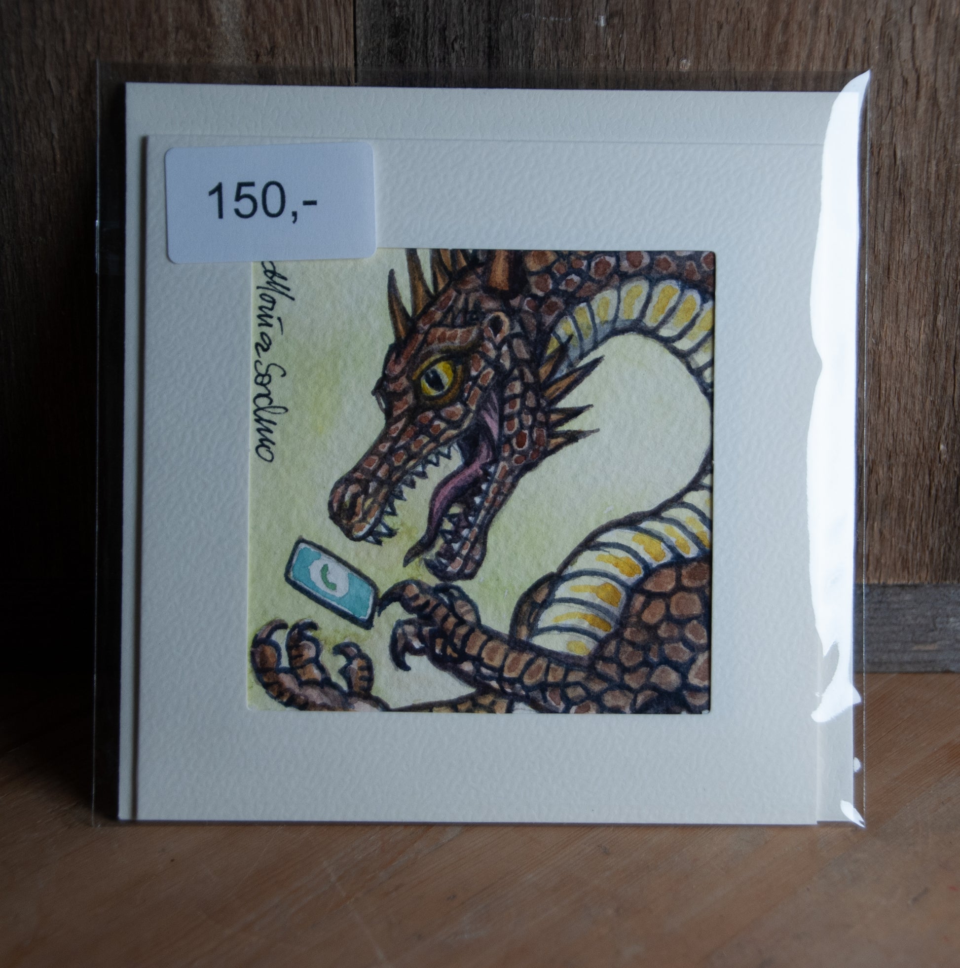 Mobildragen - en brun drage med mobiltelefon. Dette håndmalte akvarellkortet kombinerer eventyr og moderne teknologi på en humoristisk måte.
