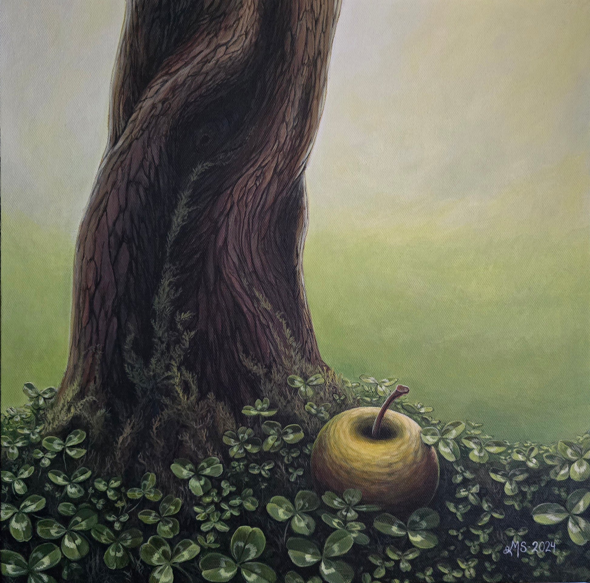 Et humoristisk og bokstavelig talt visuelt ordtak på lerret! Dette unike akrylmaleriet visualiserer det kjente uttrykket "Eplet faller ikke langt fra stammen" på en leken og kunstnerisk måte.