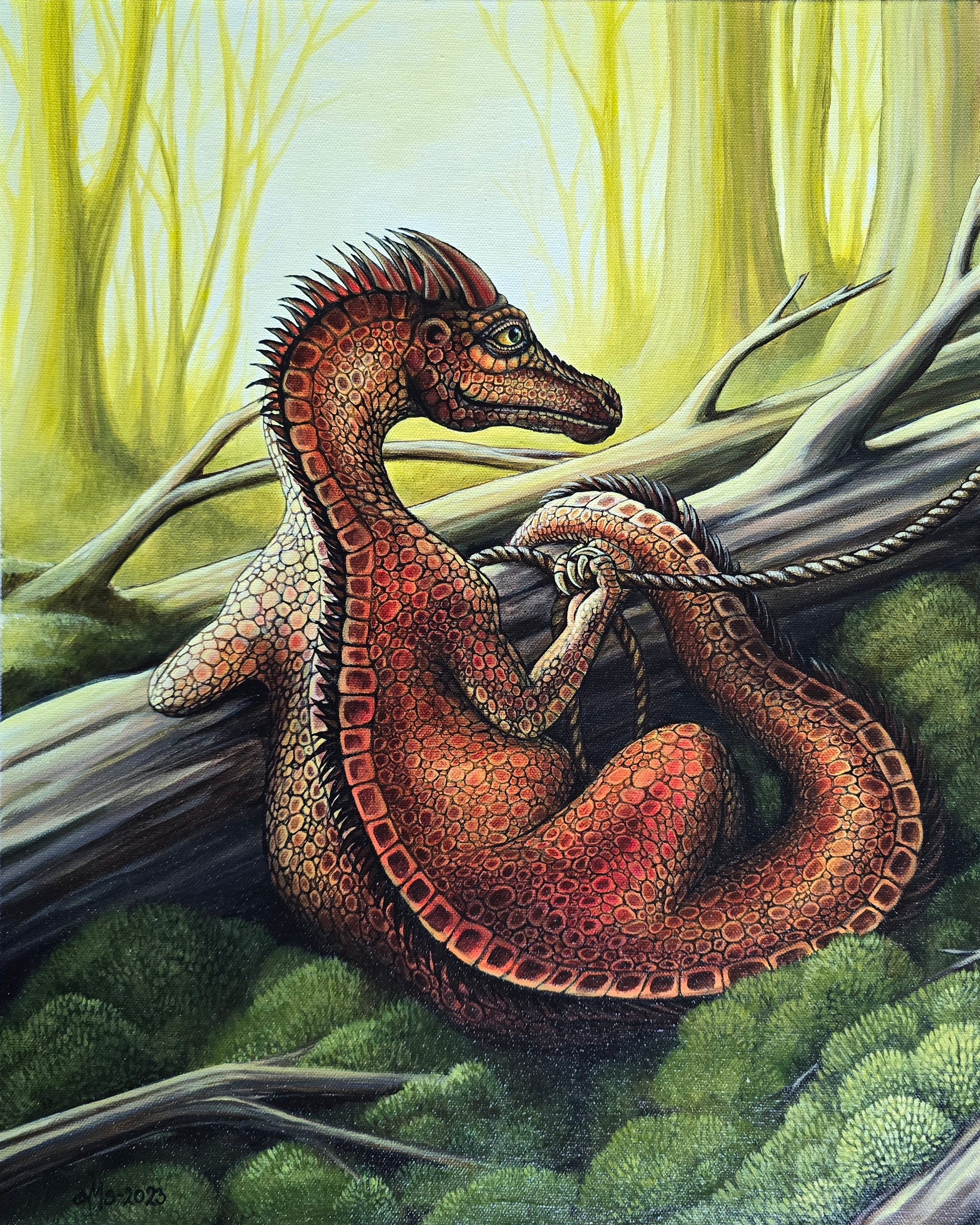 Et unikt og fantasifullt akrylmaleri som viser en skogsdrage eller skogsvesen i sitt naturlige element. Hva holder han på med? Tar han en hvil, eller planlegger han sitt neste eventyr? Dette maleriet inviterer til fantasi og undring.